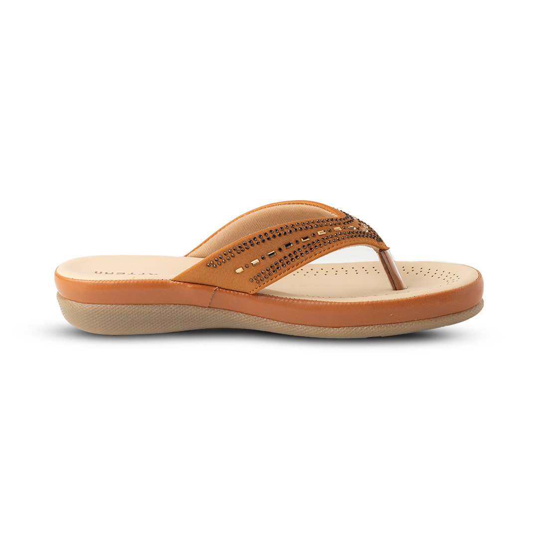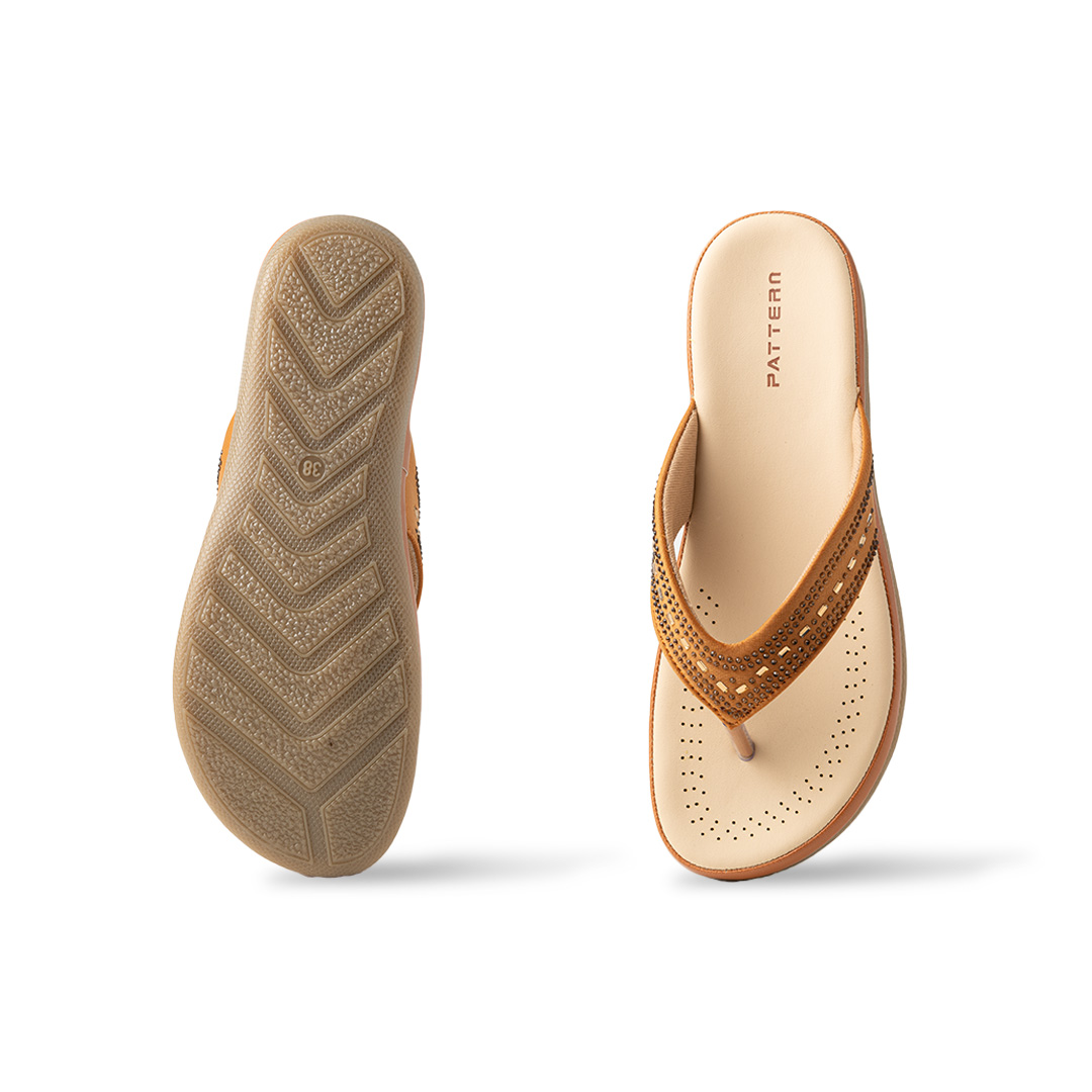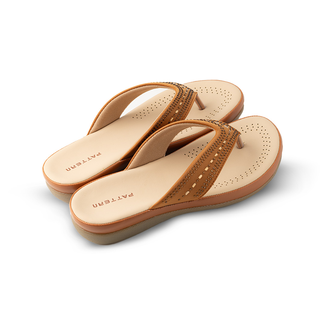 Step into elegance and comfort with these brown embellished flip-flop sandals. Designed with a soft cushioned insole for all-day wear, these sandals feature a stylish upper strap adorned with delicate rhinestones for a subtle sparkle. The ergonomic sole provides excellent grip and stability, while the breathable perforated footbed enhances comfort. Perfect for casual outings, beach strolls, or relaxing weekends, these flip-flops effortlessly combine fashion and function.