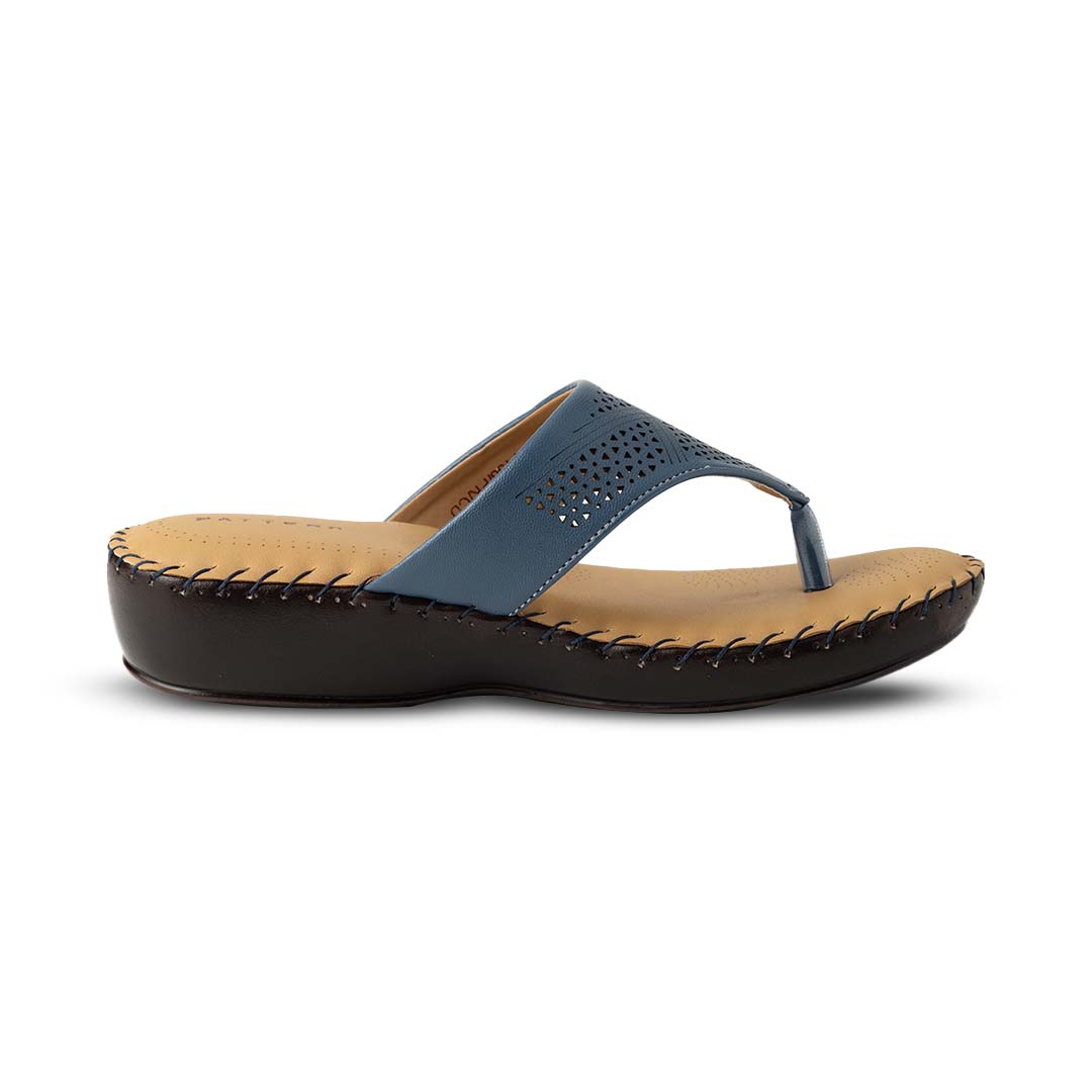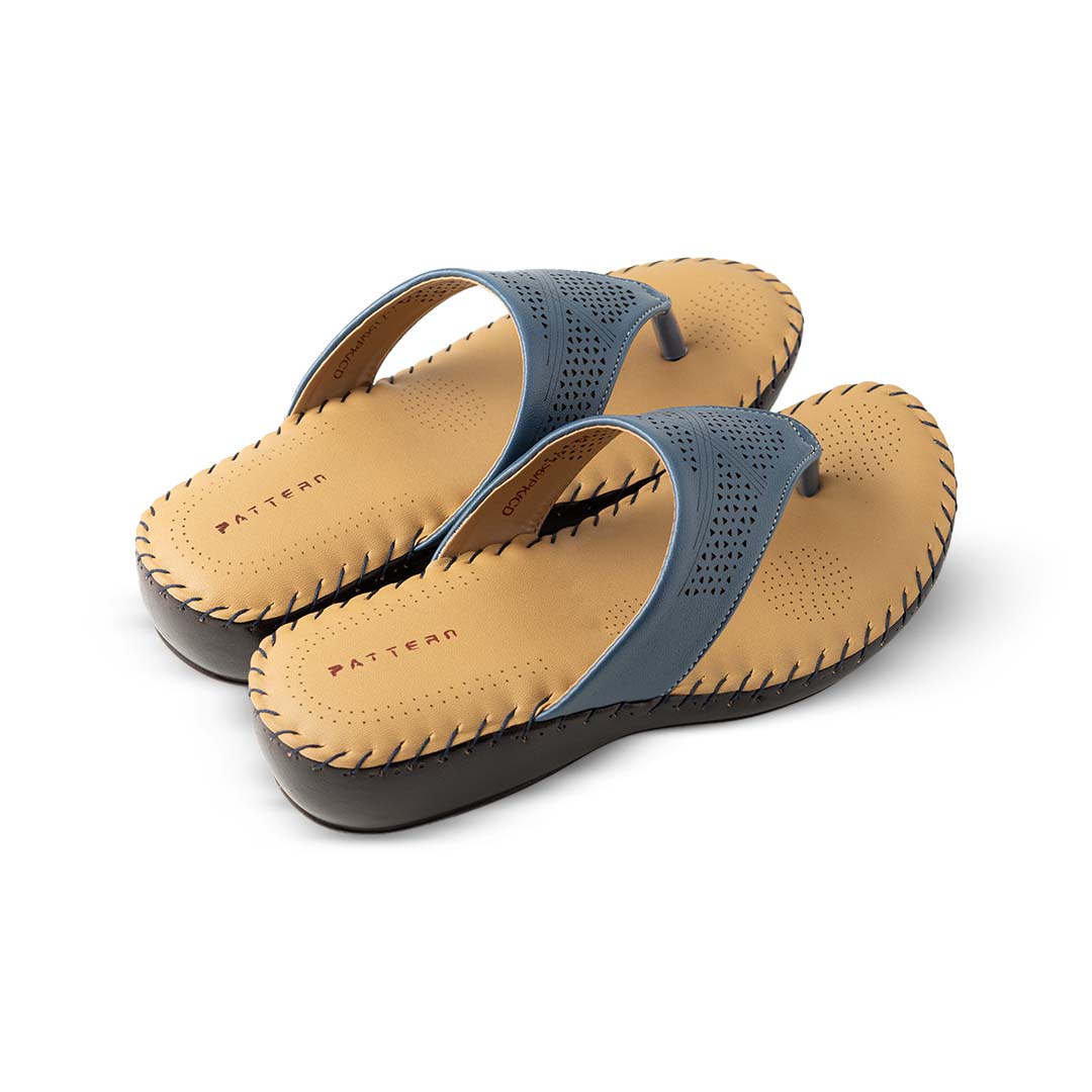 Experience comfort and style with these elegant blue slip-on sandals. Designed with a soft cushioned sole for all-day support, these sandals feature a laser-cut perforated strap for breathability and a sleek look. The classic thong-style design with contrast stitching adds a stylish touch, making them perfect for casual outings, everyday wear, or relaxed summer walks. The black sole provides durability and grip, ensuring both fashion and function.