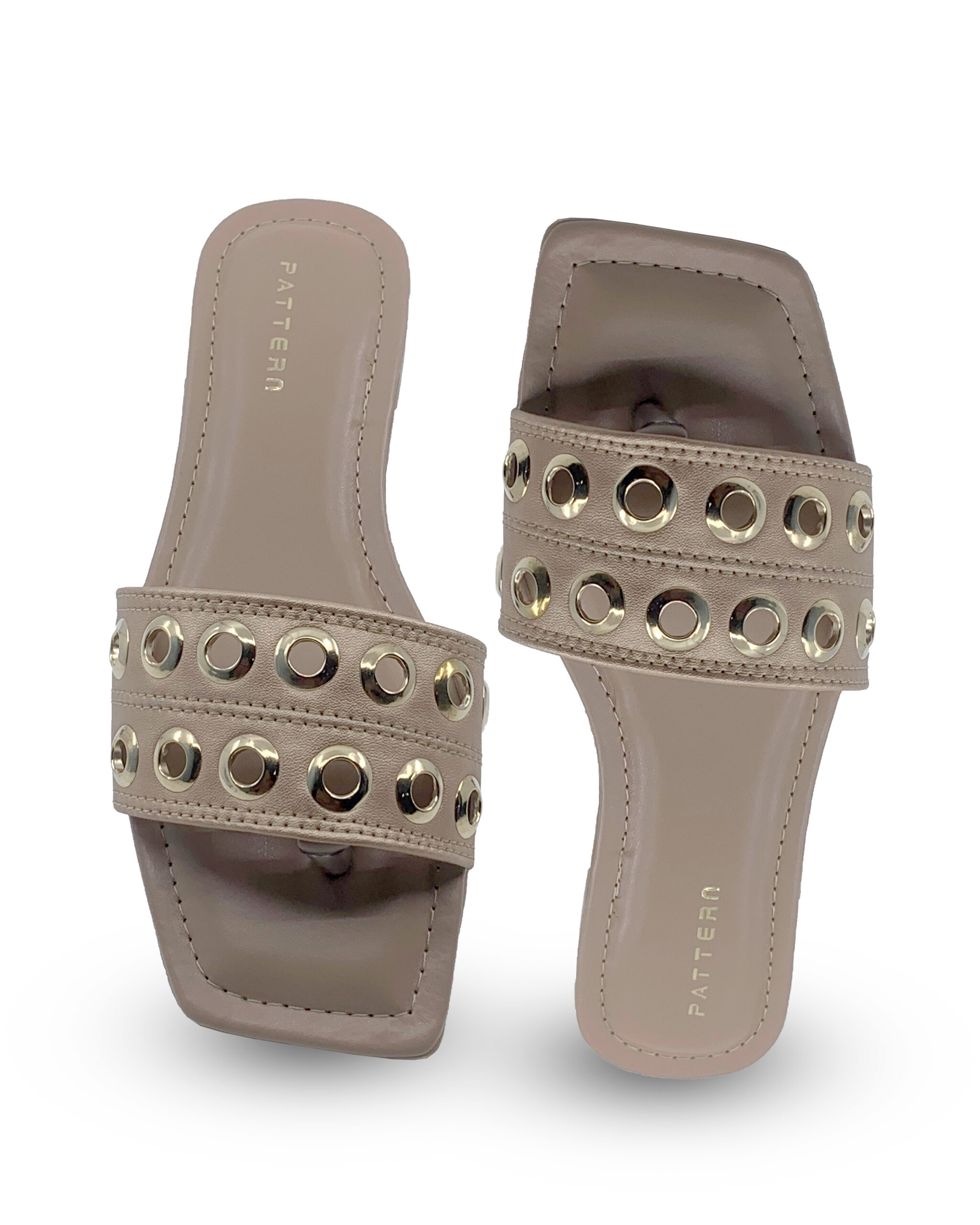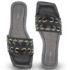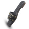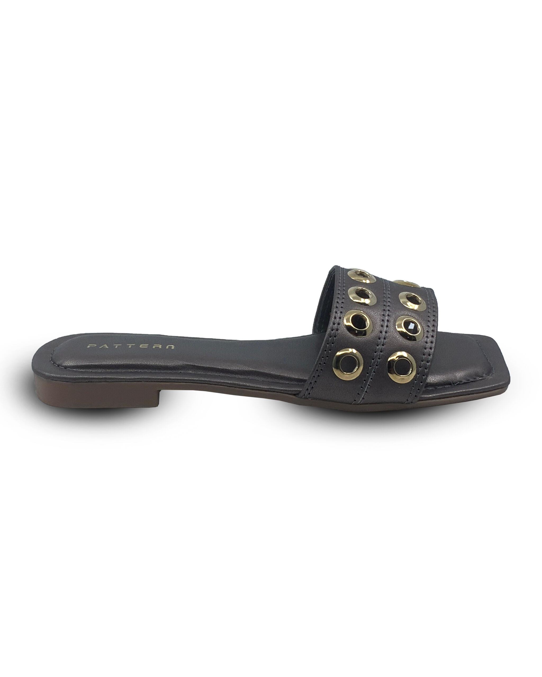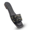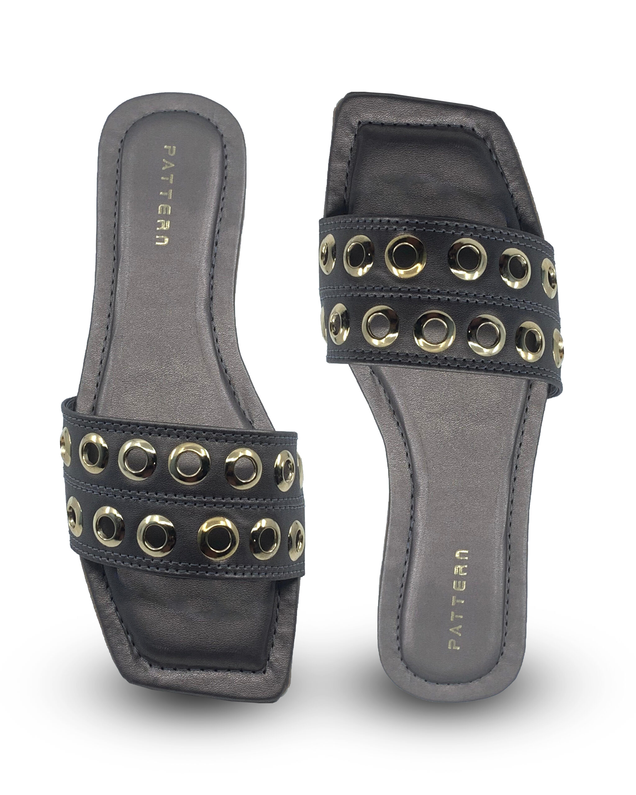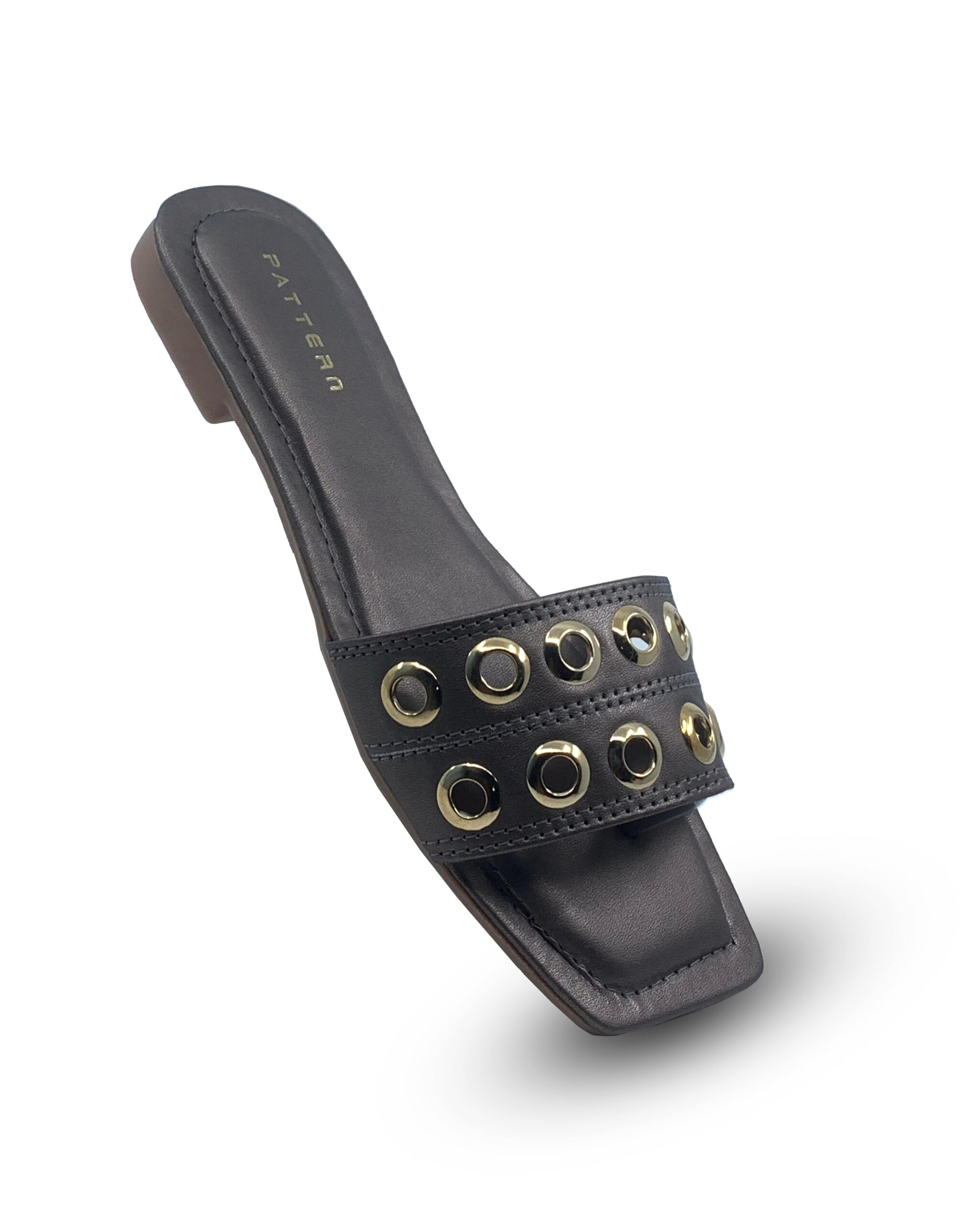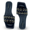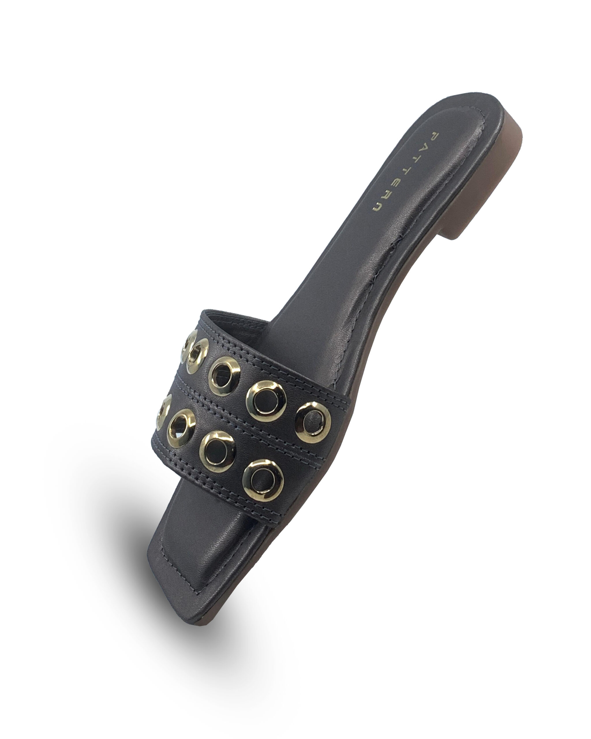 This stylish black slip-on sandal features a modern square toe design paired with a low block heel for comfort and elegance. The wide strap across the foot is adorned with bold metallic gold eyelet accents, giving it a chic and edgy appeal. Crafted with sleek black material and clean stitching, it blends sophistication with a touch of statement style perfect for elevating both casual and dressy outfits.