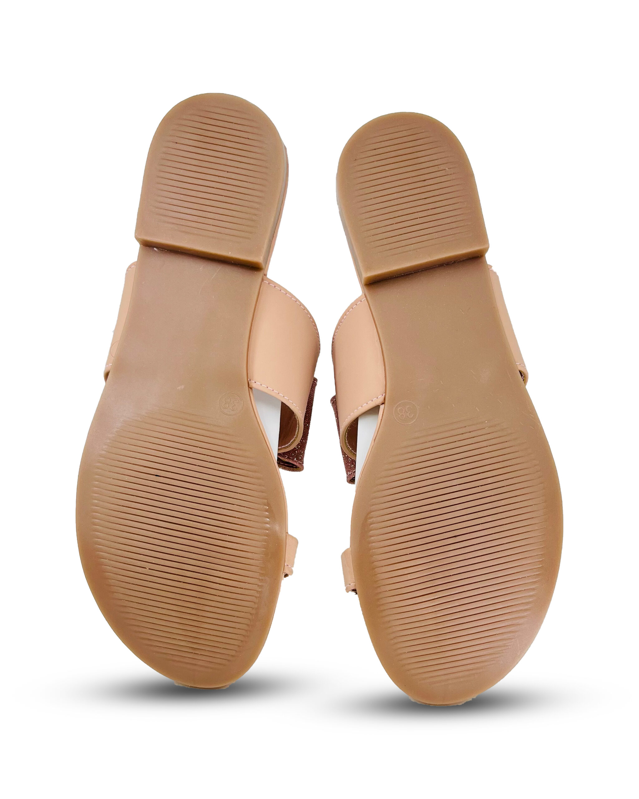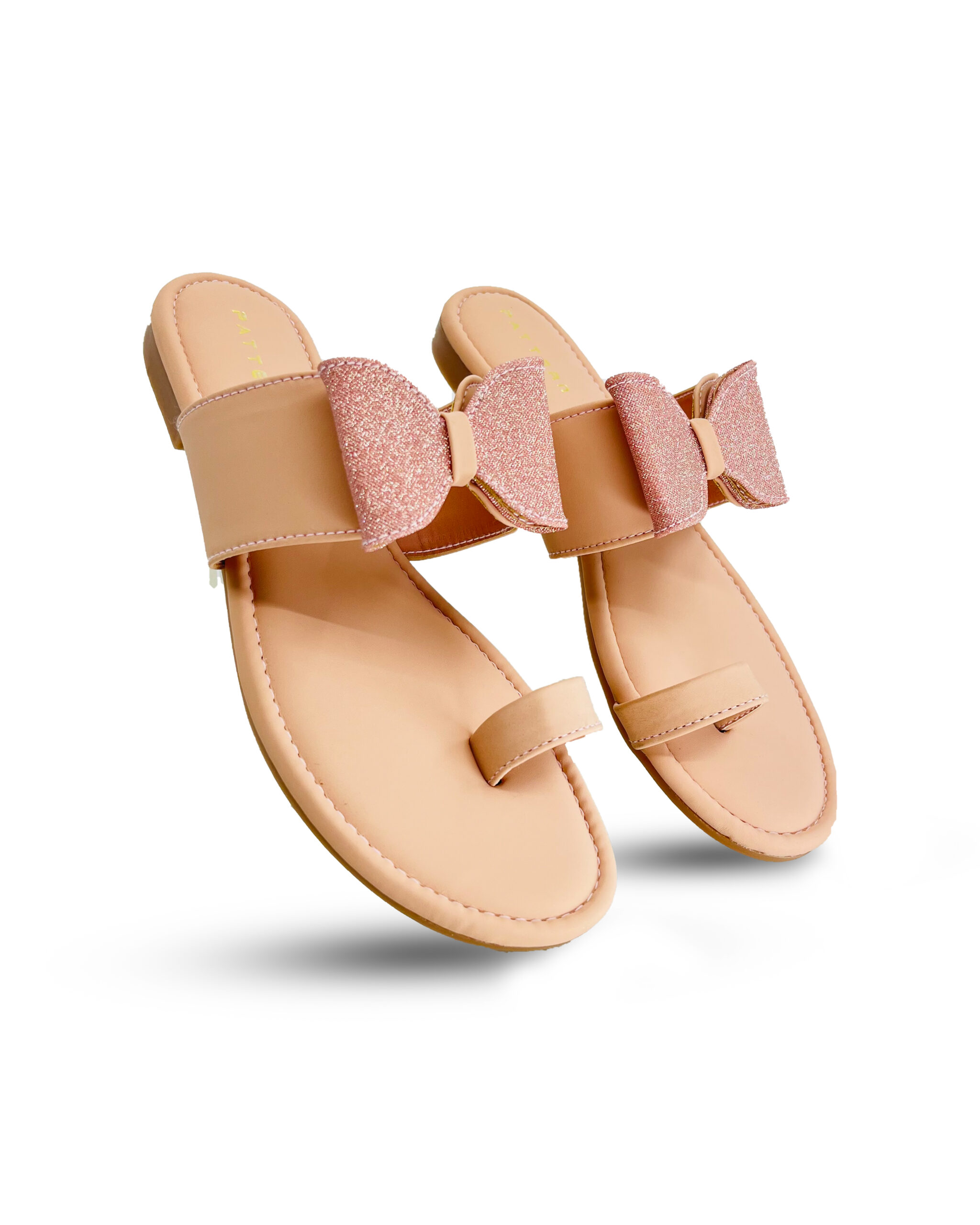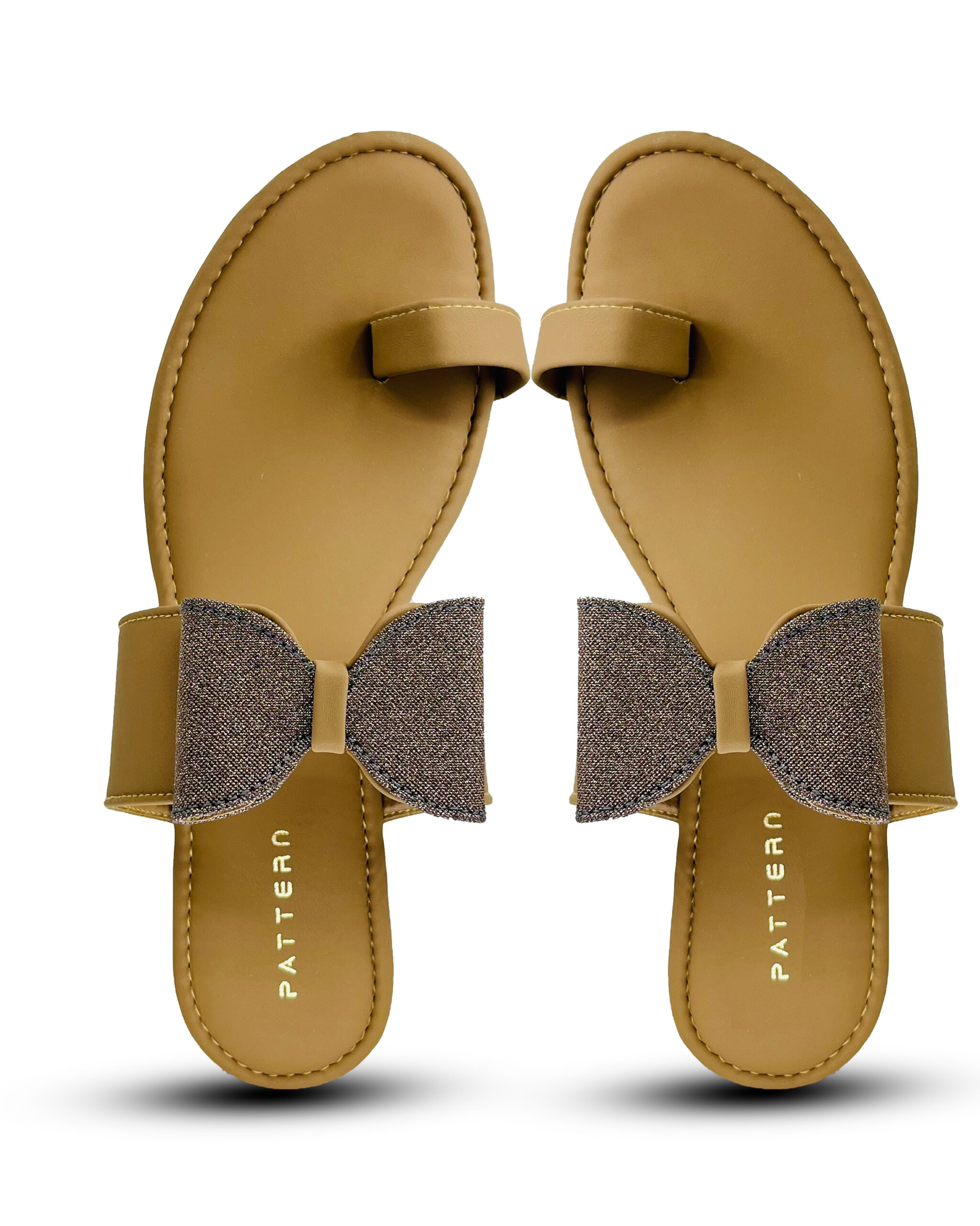 Step into elegance with these stylish chikku slip-on sandals, designed for both comfort and charm. Crafted with a soft cushioned sole and a sleek toe loop for a secure fit, these sandals feature three glittery bow accents across the strap, adding a touch of sparkle to your everyday look. Perfect for casual outings, festive occasions, or pairing with ethnic and western wear, these lightweight sandals combine fashion and ease effortlessly.